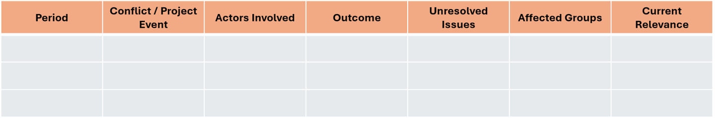 To document prior conflicts, unresolved grievances, and reputational histories from past projects, so that new projects do not enter as if on a blank slate. Communities do not treat new projects as new if prior projects have left unresolved harm.