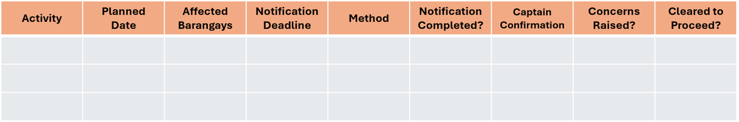 4. As notification is completed, record: notification date, channel used, barangay captain confirmation, and any concerns raised.