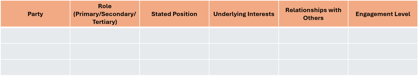 2. For each party, document: their stated position, underlying interests, relationships with other parties, and current level of engagement in the conflict.