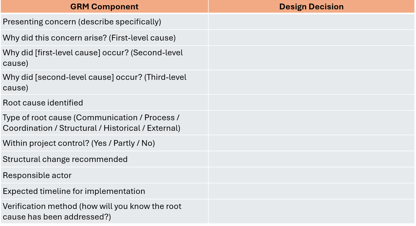 For concerns with a long history or complex multi-party dynamics, root cause analysis may require input from community members, not just project staff. Their perspective is often more accurate than an internal analysis.