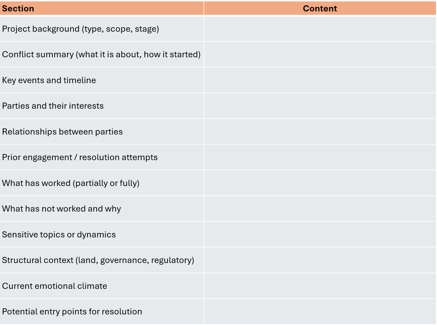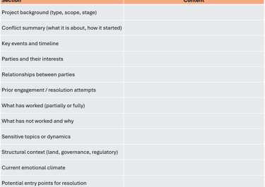 2. Include: project background, the specific conflict, parties (who they are, interests, relationships), prior engagement or resolution attempts, sensitive areas, and structural context.