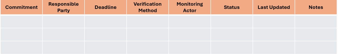 2. For each commitment, record: the specific commitment, responsible party, agreed deadline, verification method, and who is responsible for monitoring.