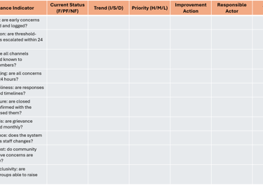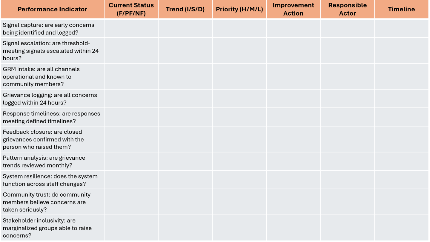 A periodic self-assessment of SE-GRM system performance, measuring signal capture quality, GRM uptake, response timeliness, feedback closure rates, and stakeholder trust indicators. The scorecard enables the project team to identify performance gaps before they become crises.