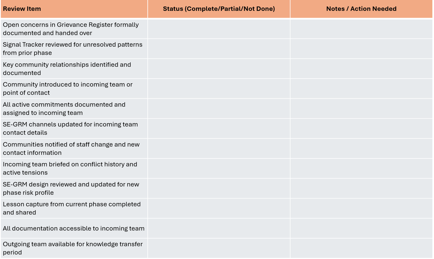 Across sites, the construction-to-operations transition was the most fragile moment in the SE-GRM lifecycle. Engagement-intensive construction teams handed over to lean operations teams with no structured knowledge transfer. Open concerns were not formally handed over. Community relationships built by construction-phase ComRel officers were not transferred.